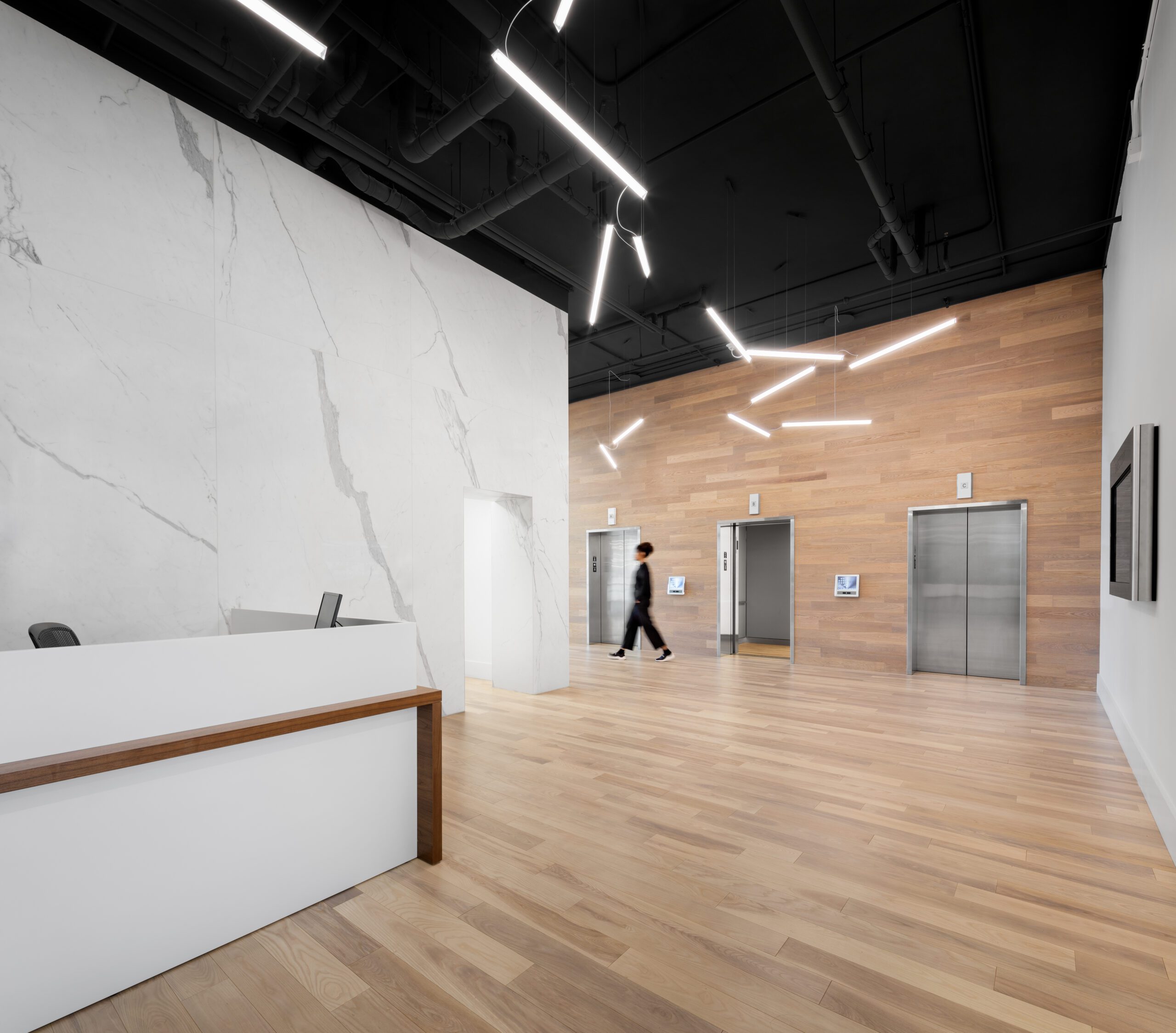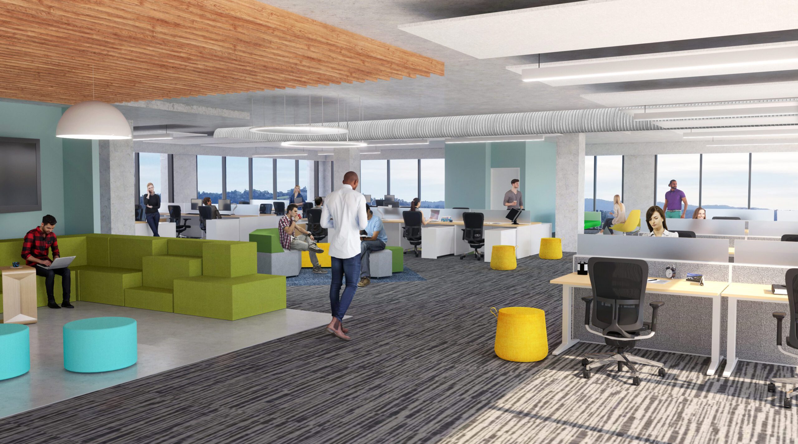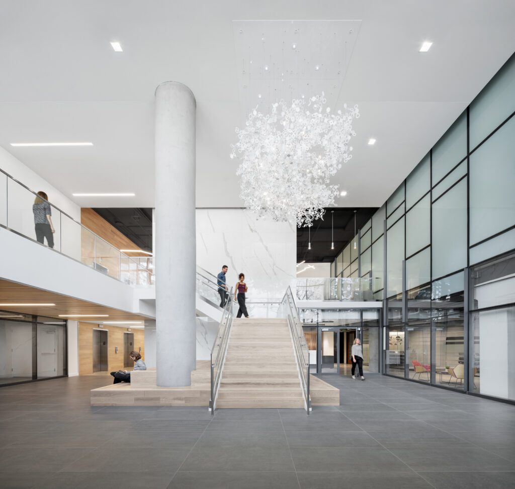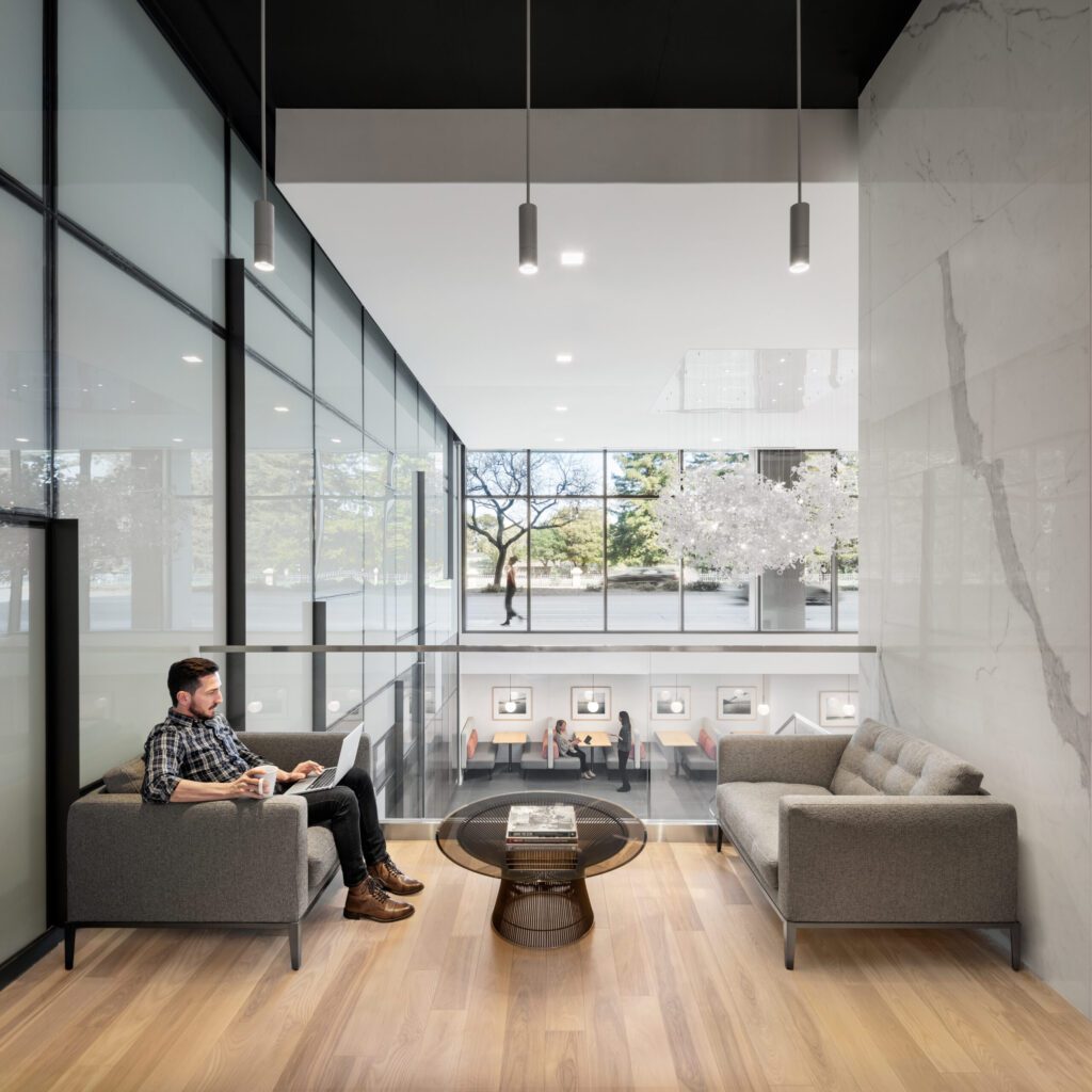 Tenants have access to showers, shared conference spaces, and ample green space on the street level.