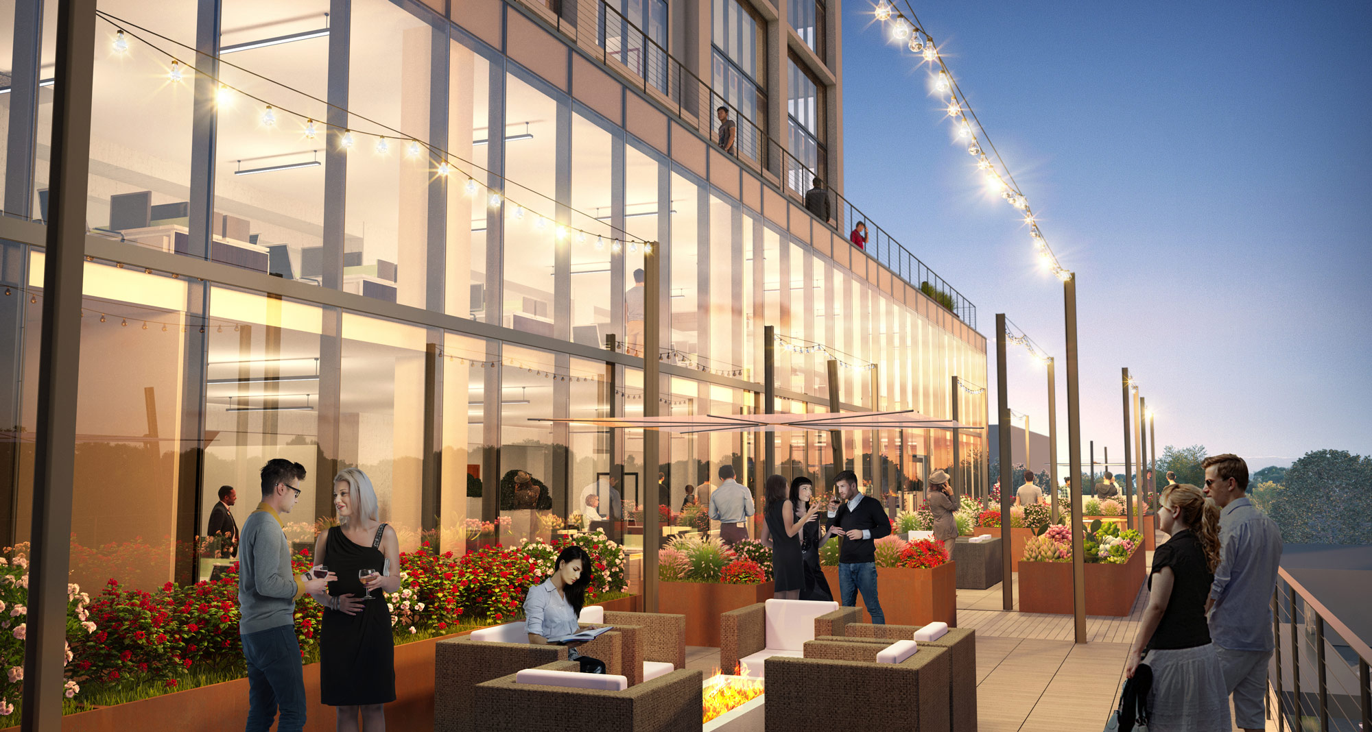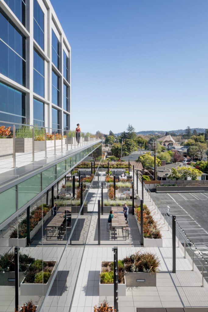 Tenants are able to enjoy a new rooftop patio on top of the 1-story annex with outdoor seating, covered areas, and natural landscaping.
