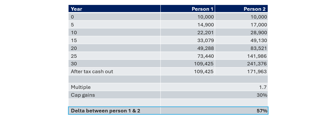 Let’s take a $10,000 investment today as an example. Say person 1 invests in a fund (real estate or venture capital, it doesn’t matter for our example) for 30 years (approximately a generation’s worth of time) and person 2 invests in direct real estate investments where they can defer capital gains taxes through 1031 exchanges. Person 1 is paying capital gains tax every 5 years and reinvesting the after-tax proceeds whereas person 2 is deferring capital gains tax and investing the full proceeds every 5 years. Further let’s assume that both are getting a 1.7x multiple on invested capital to keep things even. After 30 years, person 2 has 57% more money than person 1.